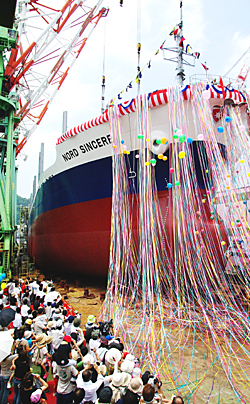 7月22日(火)、今治工場1号船台にて開催された命名進水式 (28,050M.T. D/W型 ばら積み運搬船 ・全長約169.5M・幅27.20M・深13.60M) に、公募で集められた小・中学生と保護者をお招きして、進水見学会を開催致しました。 間近で大きい船が勇壮に進水してゆく姿を見ていたこども達の目は輝いていました。将来を担う子供たちが、造船業に興味を抱くきっかけとなってくれる事を願ってやみません。