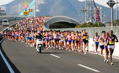 隣接の坂出市中心部を折り返すハーフマラソンには、国内外の男女7358人が参加。招待選手のスタートから最後尾まで10分以上かかるほどの混雑ぶりでした。平坦で記録が出やすい高速コースとあって、国内外の招待選手は序盤からハイピッチで飛ばし、男子は正月の箱根駅伝でも活躍したギタウ・ダニエル選手(日本大)、女子はニッキ・チャップル選手(オーストラリア)がそれぞれ優勝しました。完走は7219人でした。