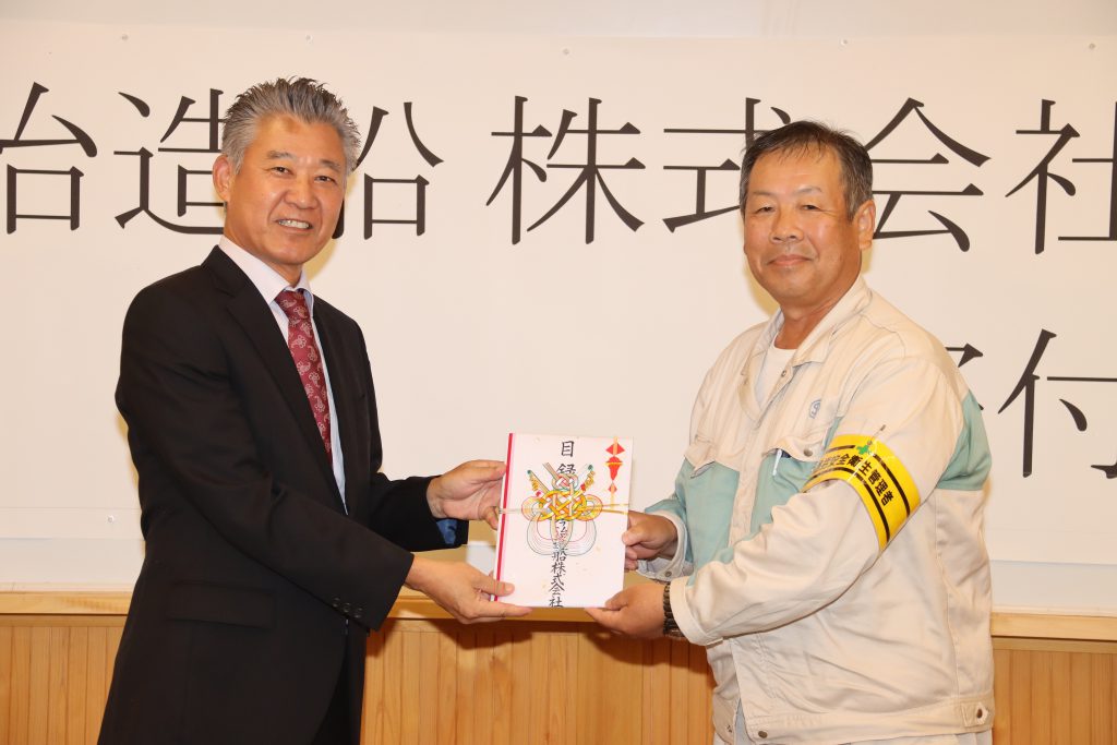 贈呈式では、田中工場長より学校長へ目録を贈呈し、学校長より感謝状を頂戴しました。また、橋田副工場長より最新の自動遮光溶接へルメットを生徒へ贈呈しました。