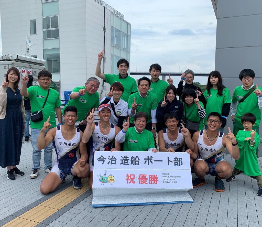 本大会はボート競技において国内最高峰の大会であり、男子クォドルプル種目には社会人・学生を問わず全国各地より18クルーが参加しました。本大会は東京オリンピックで使用された海の森水上競技場で行われ、海のコース特有の天候・水面コンディションへの対応が試合の結果を大きく左右しました。風の強いコンディションで予想外のアクシデントに苦しむクルーも多い中、今治造船クルーは高い技術力を生かして安定した漕ぎを見せました。決勝では1000m地点で既に後続艇と4秒の差をつけ、その後も学生クルーが猛追する中、終始伸びのあるリラックスした漕ぎを保ちました。2位との差を6秒に伸ばしてゴールするや否や、それぞれの選手がガッツポーズしたり、艇上に立ち上がったりして喜びを表現しました。越智選手は「最後まで集中して、確実に勝つことを意識しました。」とコメントしました。