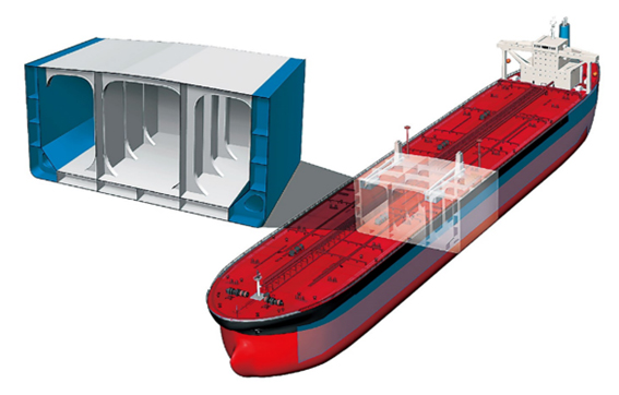 今治造船は、日本製鉄および海上・港湾・航空技術研究所とともに、船舶からの大規模油流出を防止し、海洋環境を保全するために衝突安全性の一層の向上を目指し、衝突安全性に優れた船体用高延性厚鋼板を開発しました(図1)。具体的には、最先端の数値シミュレーション(非線形有限要素法)と大型構造実験を駆使して、従来規則値の1.5倍以上の鋼材の伸びの目標を技術的に示し、その上で、延性向上のための冶金原理を確立し、厚鋼板の製造条件の高度化、量産化を実現しました。