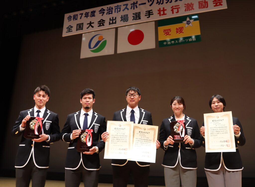 2月10日(火)、今治市公会堂にて「令和7年度今治市スポーツ功労賞等表彰式」が開催されました。この表彰式は、昨年度の全国大会で優れた成績を収めた今治市の個人・企業・団体を顕彰し、地域のスポーツ振興を図ることを目的としており、各受賞者には賞状および記念品が授与されます。