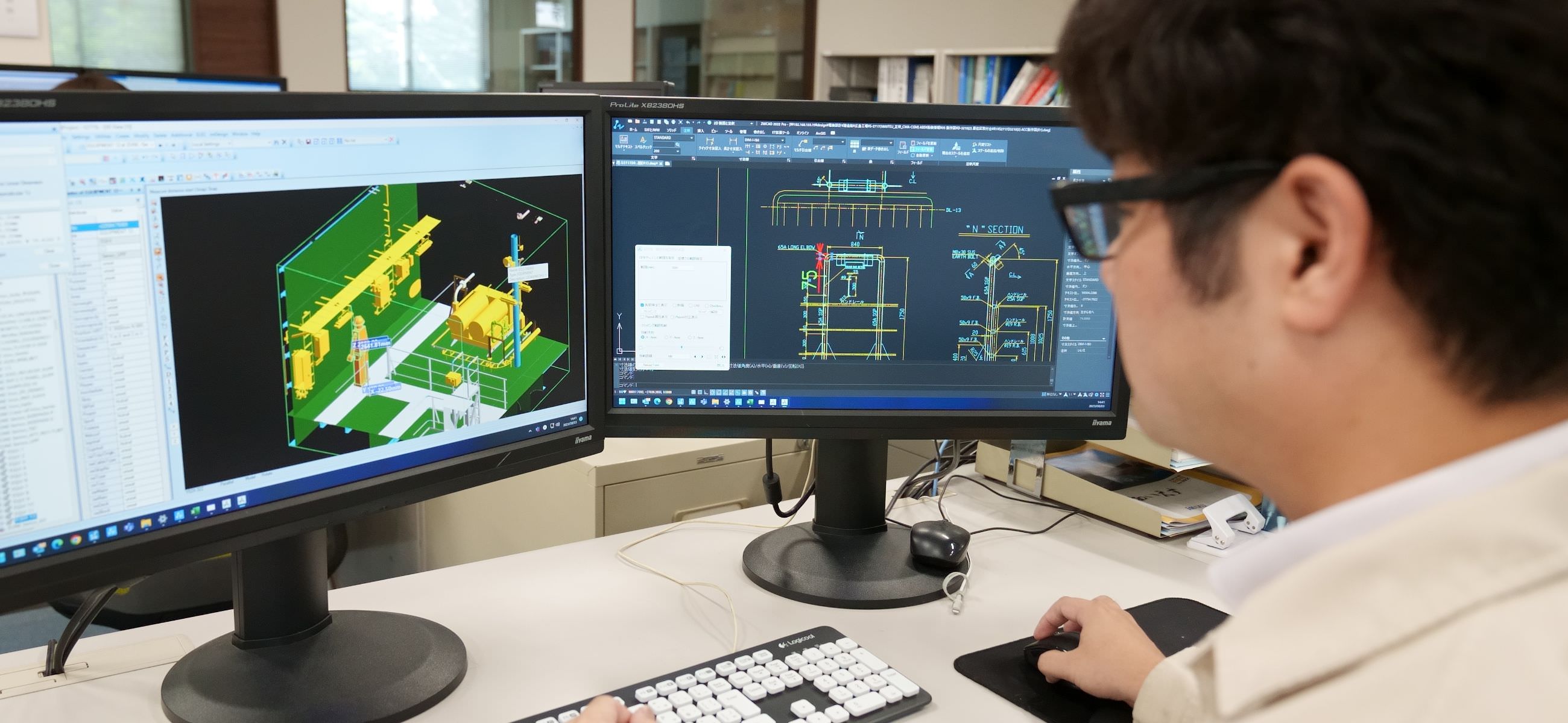 船の仕様決定を担う上流設計担当から図面や情報の提供を受け、それをもとに、現場で作業ができるような図面を作成する詳細設計業務に携わっています。中でも私の担当は電装なので、配電盤から機器までの電路を計画し、各電装品の取り付け位置とともに図面に落とします。船の中は電装品だけではなく、配管などほかの機器類がたくさんあるため、それらと干渉することがないように他部門と密に連携しながら作業を進めています。図面上は問題がないように見えても、実際の現場では作業を行うのに必要なスペースが確保できないといったケースもあるので、現場の実地確認も大切にしています。