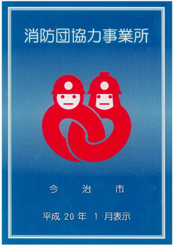 愛媛県今治市消防本部でも2008年1月よりこの制度を導入され、2月13日今治市消防本部にて、今治市長より今治造船に、消防団協力事業所表示証を交付頂きました。