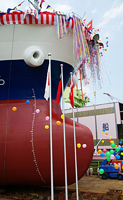 7月22日(火)、今治工場1号船台にて開催された命名進水式 (28,050M.T. D/W型 ばら積み運搬船 ・全長約169.5M・幅27.20M・深13.60M) に、公募で集められた小・中学生と保護者をお招きして、進水見学会を開催致しました。 間近で大きい船が勇壮に進水してゆく姿を見ていたこども達の目は輝いていました。将来を担う子供たちが、造船業に興味を抱くきっかけとなってくれる事を願ってやみません。