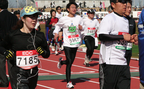 大会には、当社社員もキャラクターの「いまぞう君」が描かれたTシャツ姿で参加しました。大学時代に陸上部で活躍した取引先の女性社員は社員たちと同じTシャツを着て出場。ゴール後は満足そうな笑顔を見せていました。初参加の当社丸亀総務グループ・藤野将己さん(24)は、競技場に入って懸命のラストスパートを見せ、目標の「2時間以内」を大幅に上回る1時間45分35秒で完走。やや疲れた表情で「トラックに入ってから本当に苦しかった。自分の持てる力を全部出し切ろうと思い、最後は全力で走りました。完走できて、とても清々しい気持ちです」と話していました。
