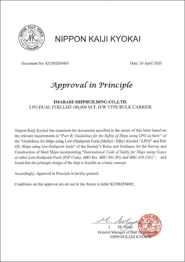今治造船株式会社はこのたび、日本海事協会(ClassNK)よりケープサイズバルカーLPG燃料船のAiP(Approval in Principle:設計基本承認)を世界で初めて取得しました。