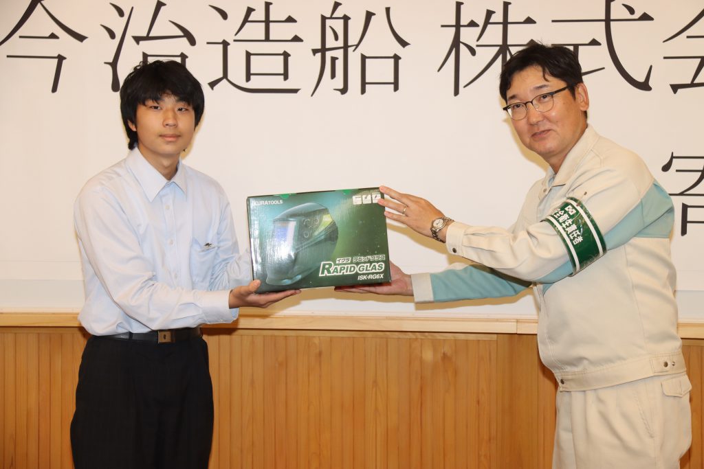 贈呈式では、田中工場長より学校長へ目録を贈呈し、学校長より感謝状を頂戴しました。また、橋田副工場長より最新の自動遮光溶接へルメットを生徒へ贈呈しました。