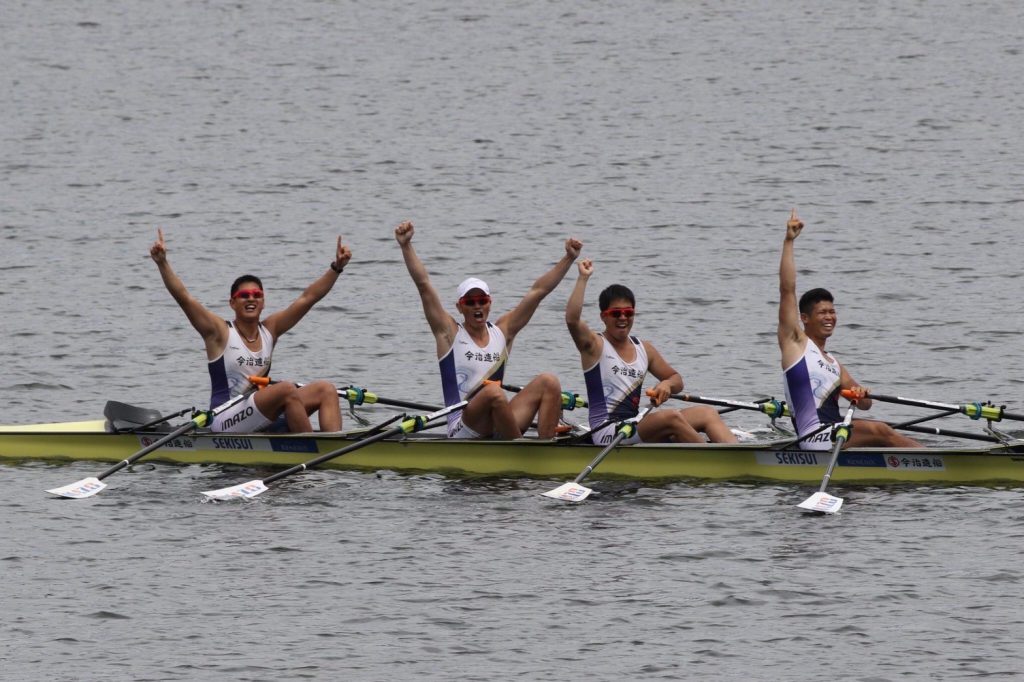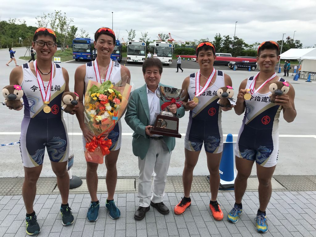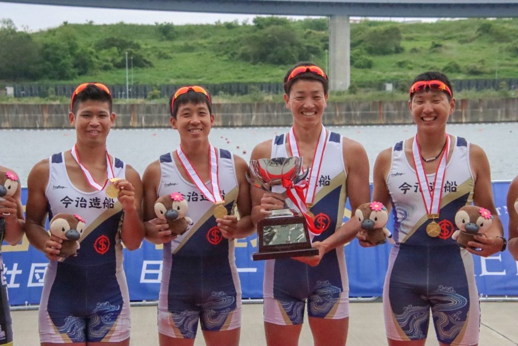 本大会はボート競技において国内最高峰の大会であり、男子クォドルプル種目には社会人・学生を問わず全国各地より18クルーが参加しました。本大会は東京オリンピックで使用された海の森水上競技場で行われ、海のコース特有の天候・水面コンディションへの対応が試合の結果を大きく左右しました。風の強いコンディションで予想外のアクシデントに苦しむクルーも多い中、今治造船クルーは高い技術力を生かして安定した漕ぎを見せました。決勝では1000m地点で既に後続艇と4秒の差をつけ、その後も学生クルーが猛追する中、終始伸びのあるリラックスした漕ぎを保ちました。2位との差を6秒に伸ばしてゴールするや否や、それぞれの選手がガッツポーズしたり、艇上に立ち上がったりして喜びを表現しました。越智選手は「最後まで集中して、確実に勝つことを意識しました。」とコメントしました。