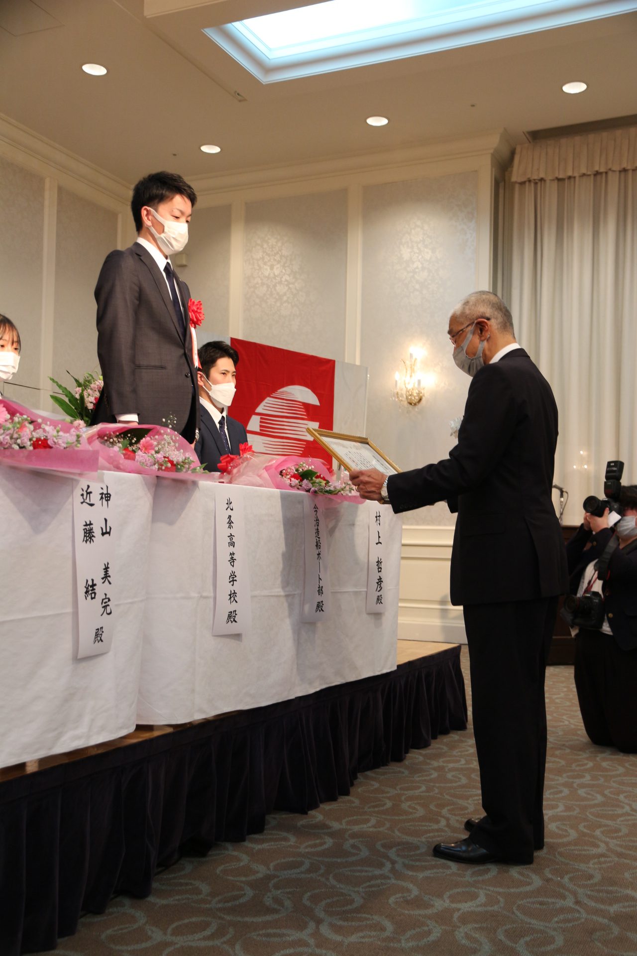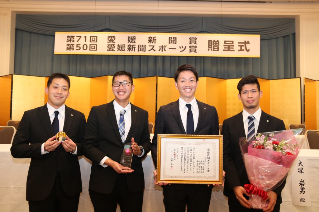 今治造船ボート部に所属する岡部政憲選手(西条営業T)、越智寛太選手(品質管理T)、御手洗航選手(施設管理T)、木村竜暉選手(品質管理T)は、第100回全日本選手権男子舵手なしクォドルプルで優勝したことにより受賞対象となり、愛媛新聞社の土井英雄代表取締役社長より表彰状と記念品を授与されました。