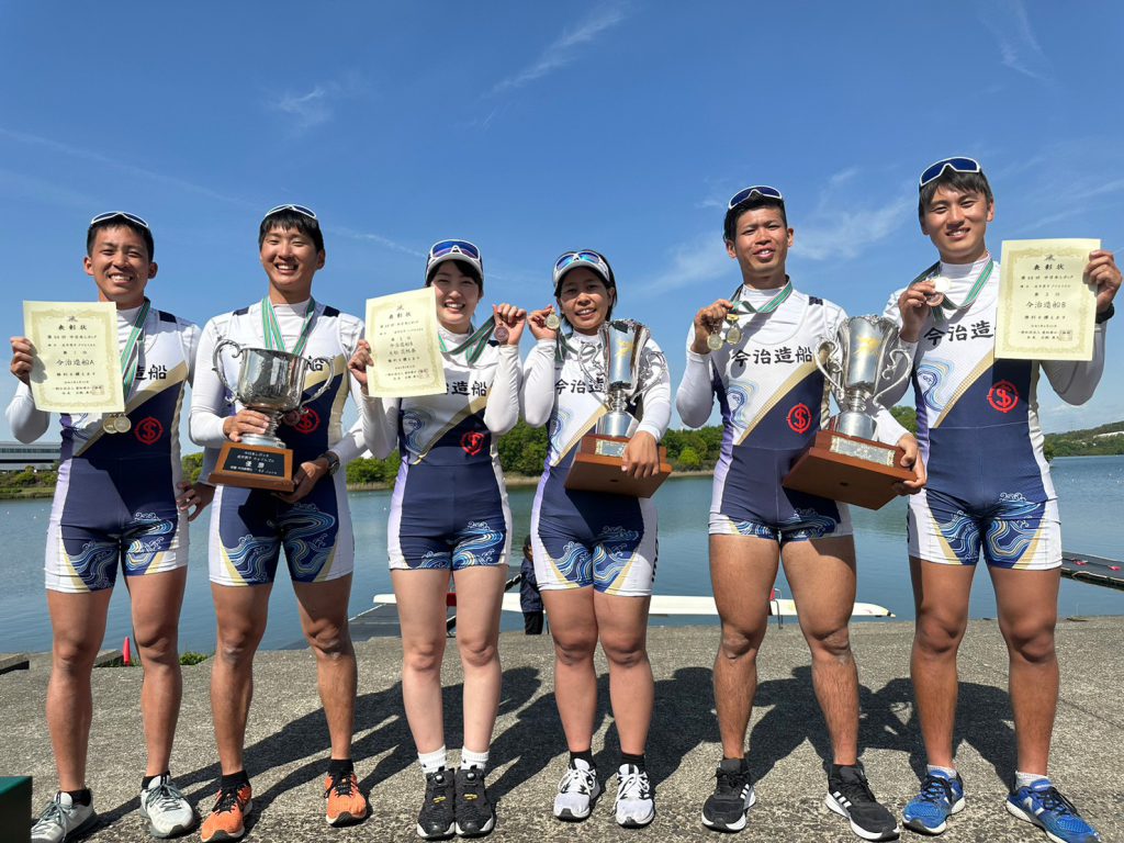 4月20日(金)~23日(日)、愛知県・愛知池漕艇場にて「第68回中日本レガッタ」が開催され、当社ボート部の男子クォドルプル(越智寛・御手洗・木村・越智竣)が優勝、男子ダブルスカルでは今治造船A(越智寛・木村)が優勝、今治造船B(御手洗・越智竣)が3位に入賞。また、女子種目ではダブルスカルが6位に入賞、シングルスカルでは西が優勝、大松が3位に入賞という素晴らしい成績を収めました。