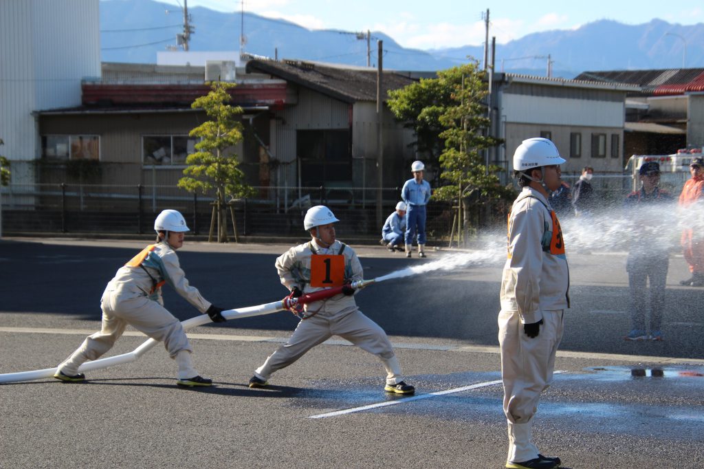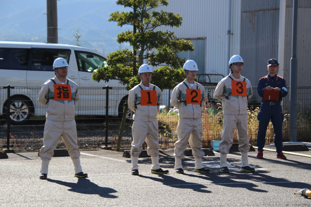 当社含め西条市内の企業から5チームが出場しており、いずれの企業も指揮者の号令の元、きびきびとした統率の取れた操法で訓練の成果を発揮していました。西条工場チームは4番目のスタートとなり、若干緊張の様子もみえましたが、日ごろの訓練通りに終えることが出来ました。
