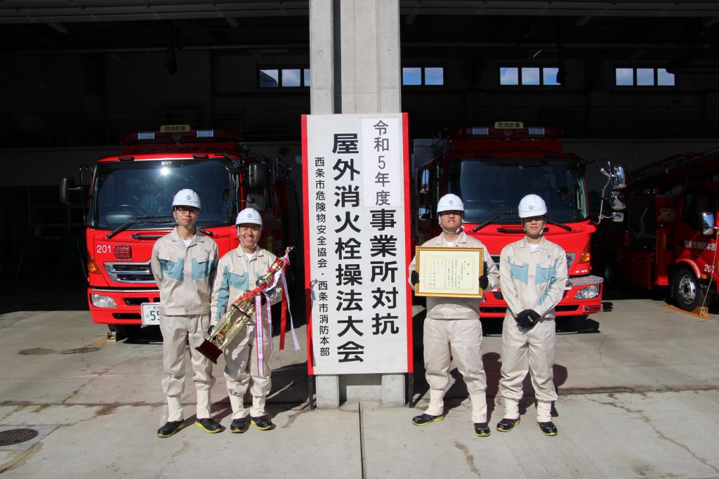 11月14日(火)西条市危険物安全協会、西条市消防本部主催の「令和5年度 事業所対抗消火栓操法大会」が開催され、西条工場から若手社員でチームを編成し出場しました。本大会は各事業所の自衛消防組織の消火技術向上を目的として開催されておりましたが、今年を最後に30年以上の歴史に幕を閉じます。最後の大会ということで各事業所が優勝を狙う中、見事西条工場チームが優勝を果たしました。