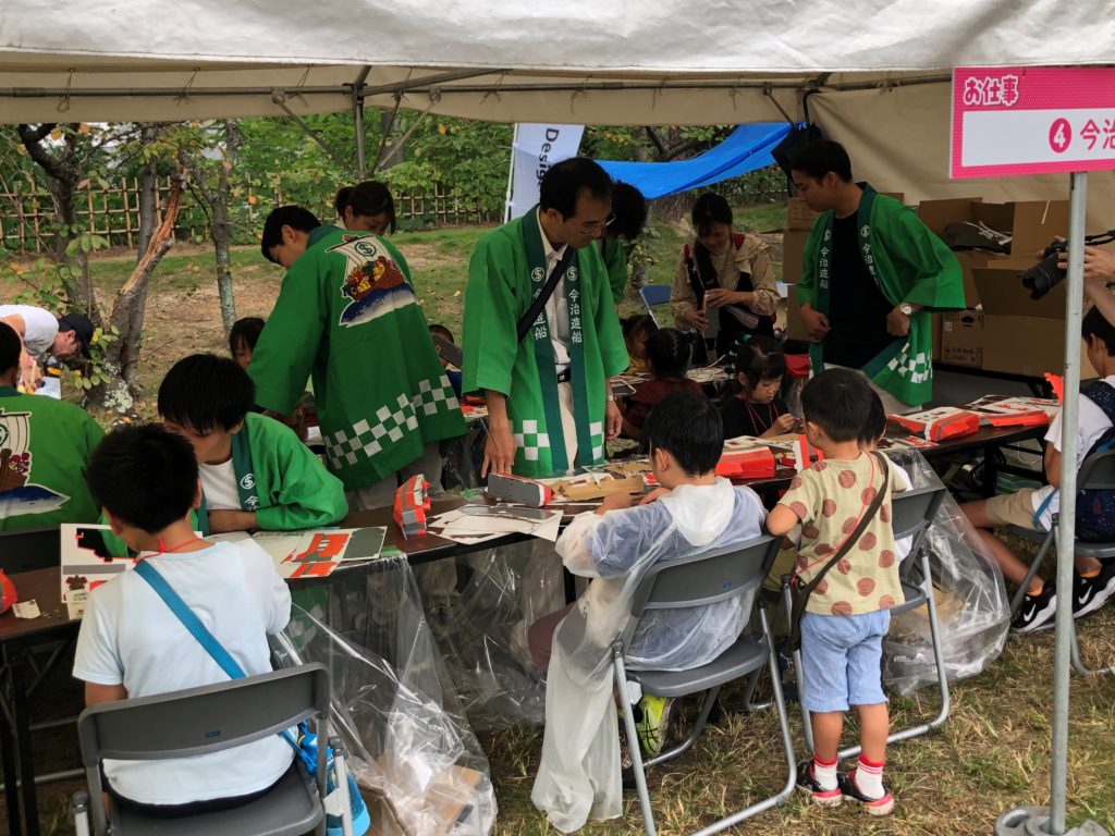 10月19日(土)、子供向け仕事体験イベント「第3回ワクワク体験kids王国in丸亀」へ当社のブースを出展いたしました。ブースでは、ペーパークラフトを用いた自動車運搬船の模型製作体験コーナーを設け、丸亀工場スタッフのサポートのもと多くの子供達に船造りの楽しさを体験して頂きました。模型が完成する度に参加した子供、ご家族から笑顔が広がっていました。また、体験コーナー参加者へSDGsへの寄与を念頭に製作した当社のロゴ入りエコバックや、今治市のご当地ゆるキャラ「バリィさん」のグッズも配布し、大変喜んで頂けました。