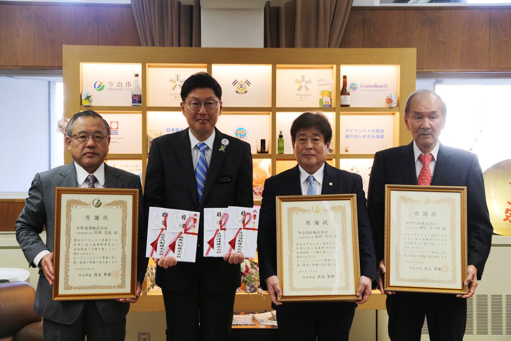 11月5日(火)、今治市役所において、今治市海事都市交流委員会(※)の会員企業から今治市に対して、未来創生のために寄附金20億円が贈呈され、徳永繁樹今治市長から各企業に対して感謝状が手渡されました。