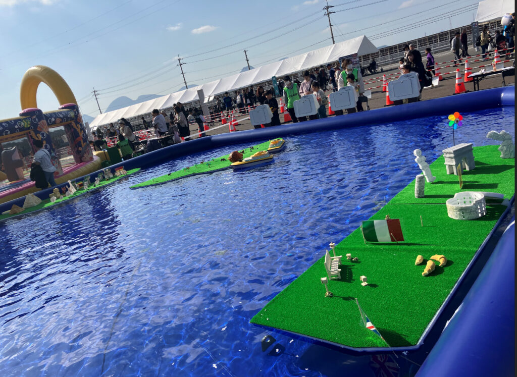 キッズコーナーでは、プールに手作りの島を設置したラジコンボート体験を実施。子どもたちは遊びながら貿易や海運の仕組みに触れる学びの時間となりました。また、特設エリアで行われた「福まき大会」では、豪華景品も用意され、歓声と拍手に包まれました。