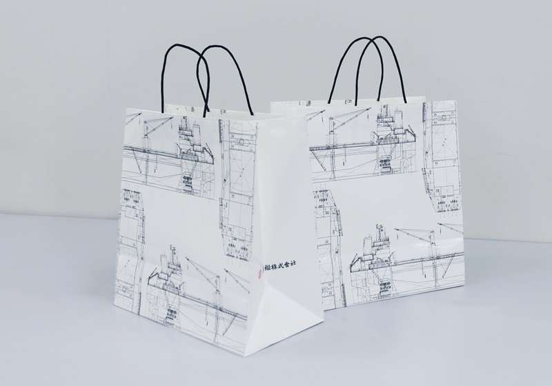 社内若手メンバーを中心にプロジェクトチームを結成し、1年以上にわたる製作期間を経て、新しい「いまぞう袋」が誕生しました。新デザインは当社の社員が考案したもので、今治造船グループにおいて建造実績の豊富な「64,000載貨重量トン型ばら積み運搬船」の設計図を使用した造船所ならではの意匠となっています。