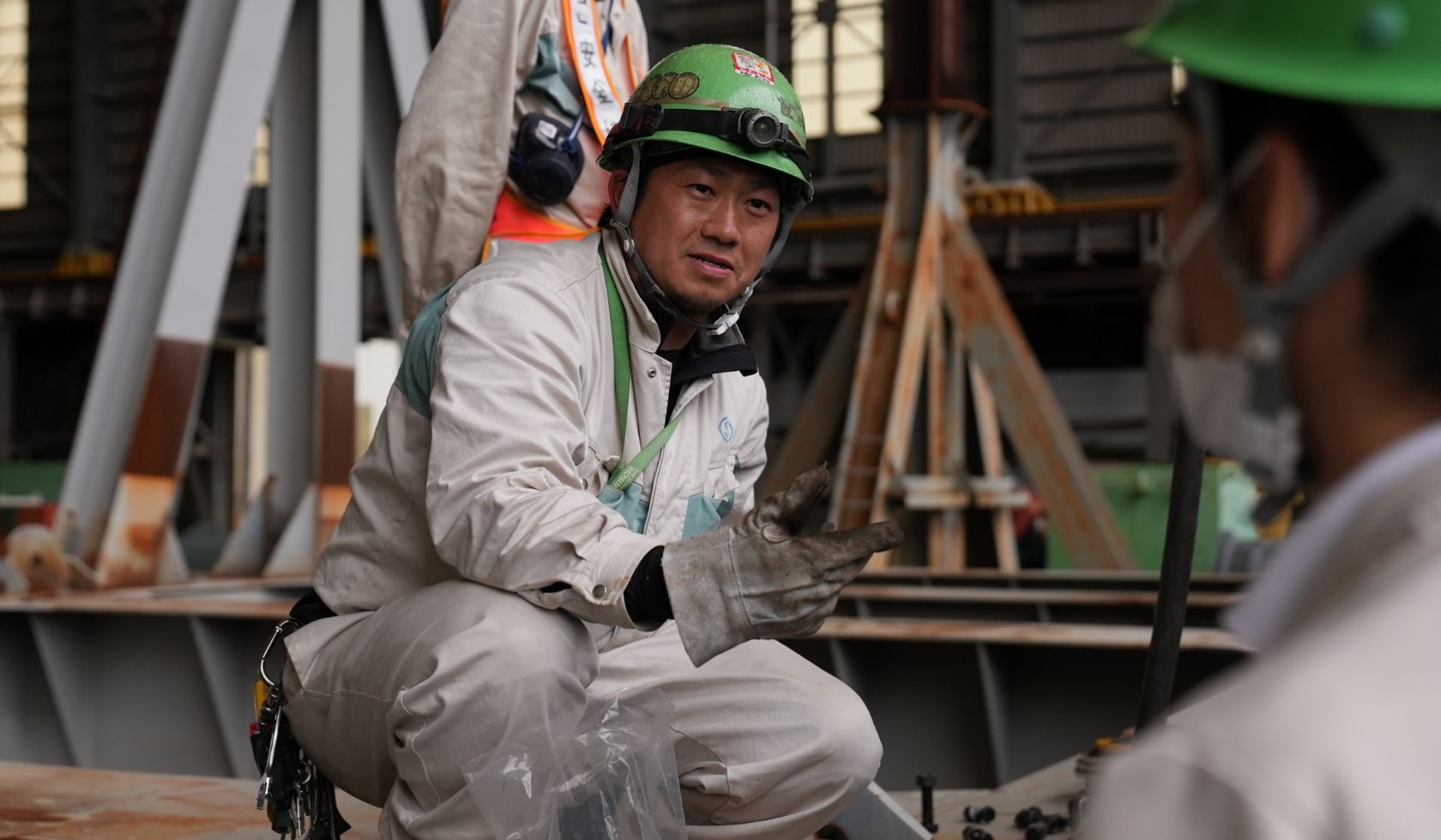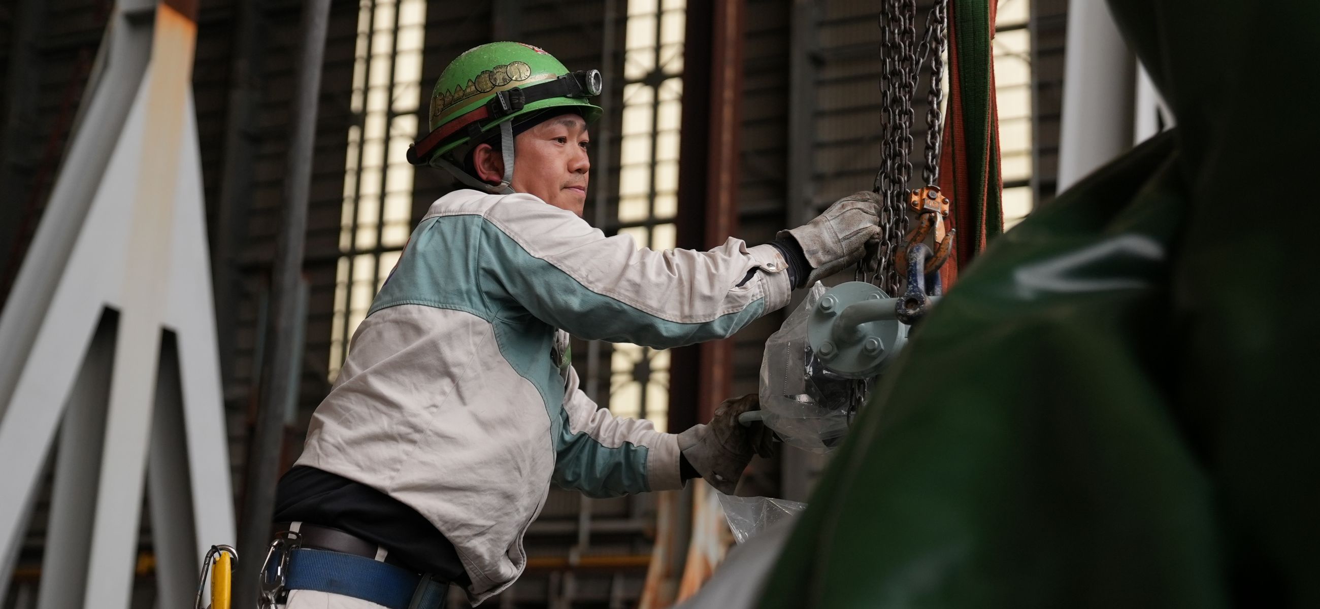 建造船のエンジンルームにおける機関機器や電源装置などの積み込み・据え付け・調整を担当しています。現在は副作業長として、後輩の指導もしながら作業を実施。船種によって機器はさまざまですが、工程通り進めるよう努めています。扱う機器には大きく重いものもあるので、カラダをよく使う仕事です。自分はサッカーや陸上といったスポーツ経験者ですが、同僚もスポーツマンが多いです。