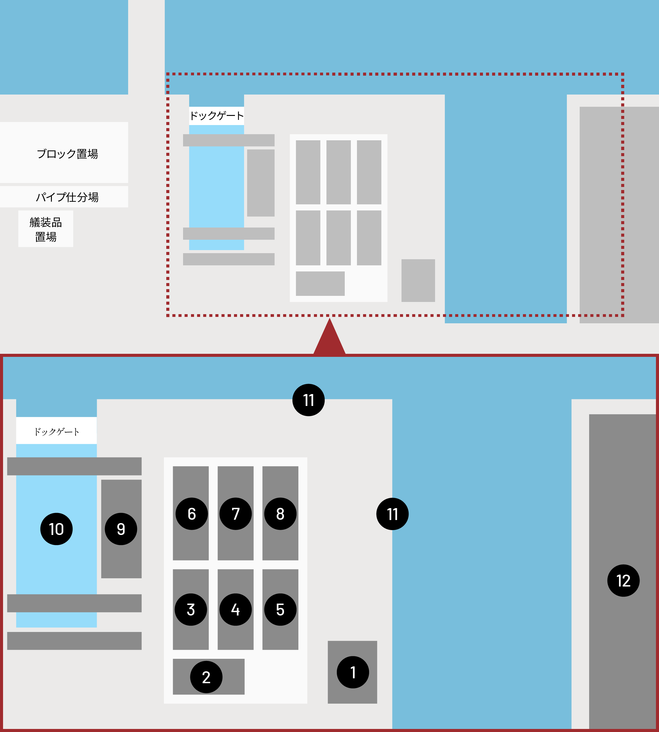 建造建屋で製作したブロックをつなぎ合わせ、クレーンの荷重範囲内まで大きくするステージです。最大で1,400tの大きなブロックを仕上げることができます。