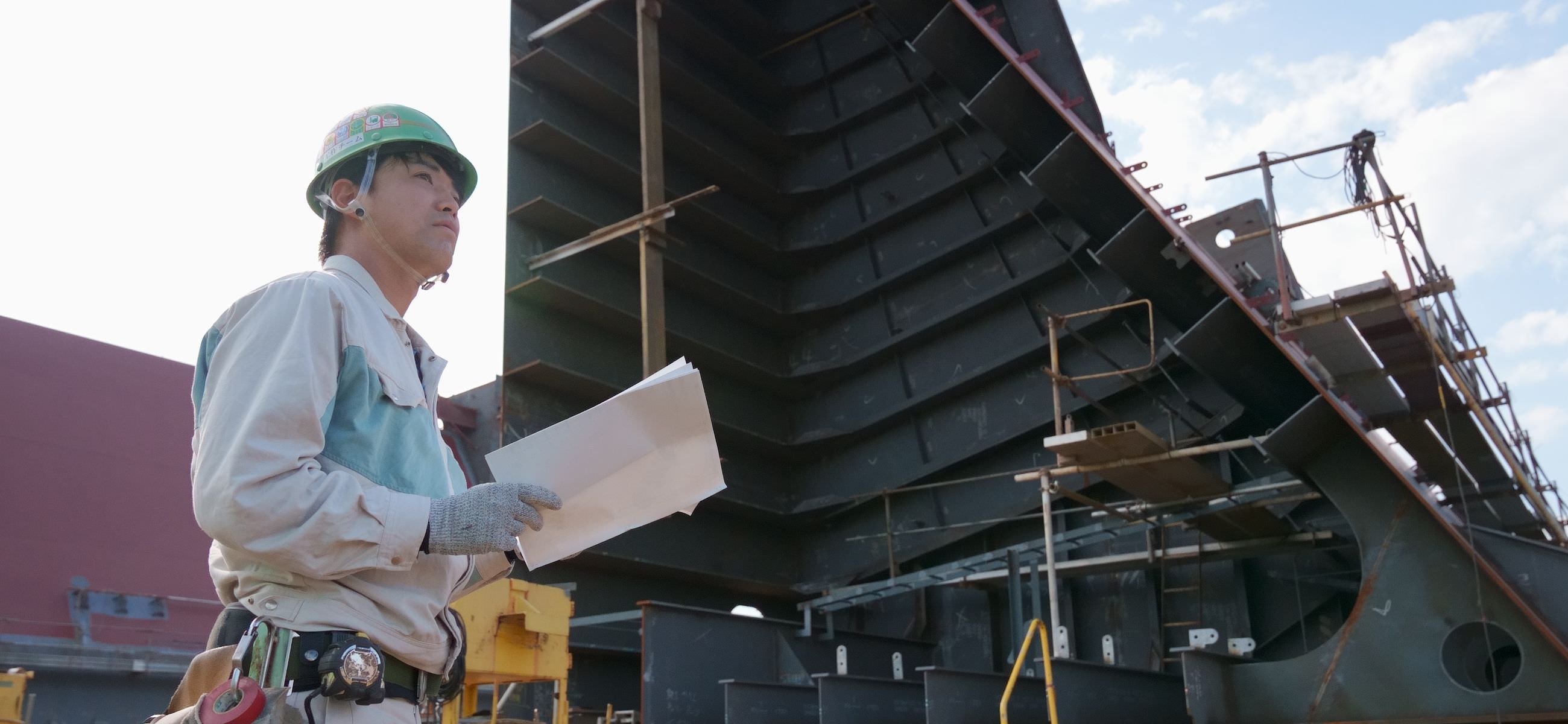 現在所属している部門は、今治造船グループの各事業所の支援部門として、各事業所では施工が難しいブロックの施工を請け負っています。私はその工程管理担当として、さまざまな船型のブロックを施工するにあたり、船殻(船体の外壁)工事の工程計画と進捗管理を行っています。